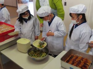 4月16日、1年生の給食が始まりました。最初に、担任から、整列の仕方や食管、食器等の運び方、机のふき方等について教えてもらいました。運んできた食管や食器をテーブルに並べ、いよいよ盛り付け。上手にできるか心配しながら見守りました。しかし、心配ご無用!自分の仕事を手際よくこなす1年生に脱帽。去年まで、こども園や保育園で教えていただいてきたことが身についていました。配膳もばっちり!誰もこぼすことなく、「いただきます!!」みんなおいしそうにニコニコ笑顔で、小学校最初の給食を味わっていました。「めっちゃ、おいしい!!」子供たちの感想です。たくさん食べて、大きくなあれ!!